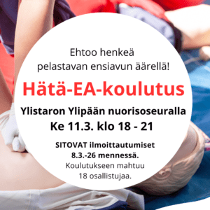 Hätä-EA-koulutus Ke 11.3. klo 18 – 21 Ylistaron Ylipään nuorisoseuralla Koulutukseen mahtuu 18 osallistujaa, joten ilmoittaudu ja varmista paikkasi. Toiminta onnettomuus / sairaskohtaustilanteessa Hätäilmoitus (112-sovellus) Pyörtynyt, oireet ja ensiapu Tajuton, oireet ja ensiapu Eloton, oireet ja ensiapu Harjoitus, kylkiasentoon kääntäminen Harjoitus, painelu-puhalluselvytys Anne -nukella Harjoitus, defibrillaattorin käyttö Koulutus sisältää laattialla makoolua ja pyörimistä, notta kamppehet sitä...